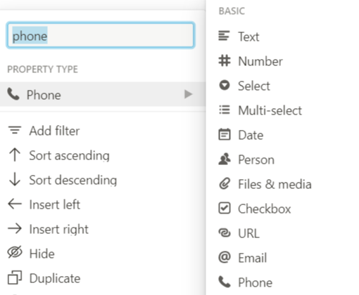 Text, number, Select, Multi-select, Date, Person, Files&Media, Checkbox, URL, Email, Phone์ด ์๋ค.