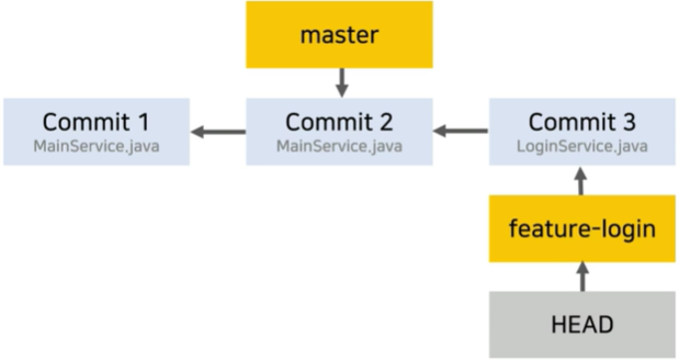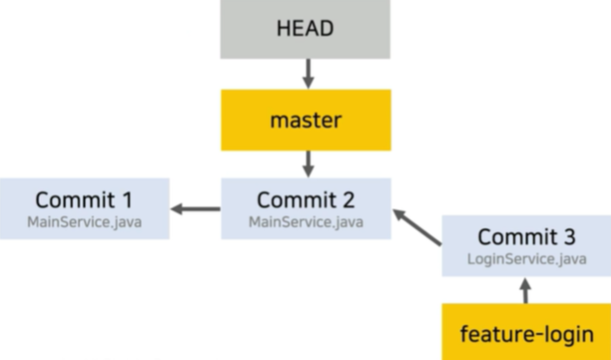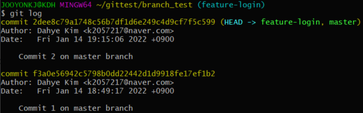 โซ $ git log ๋ช ๋ น์ด๋ก ํ์คํ ๋ฆฌ๋ฅผ ๋ณด๋ฉด HEAD๊ฐ feature-login์ ๊ฐ๋ฆฌํค๊ณ ์๋ค.