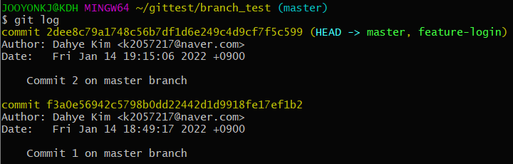 โซ $ git log๋ก ํ์คํ ๋ฆฌ๋ฅผ ํ์ธํด๋ณด๋ฉด HEAD๋ master๋ธ๋์น๋ฅผ ๊ฐ๋ฆฌํค๊ณ ์๊ณ , feature-login์ ์์ฑ๋ง ๋ ์ํ์์ ๋ณผ ์ ์๋ค.
