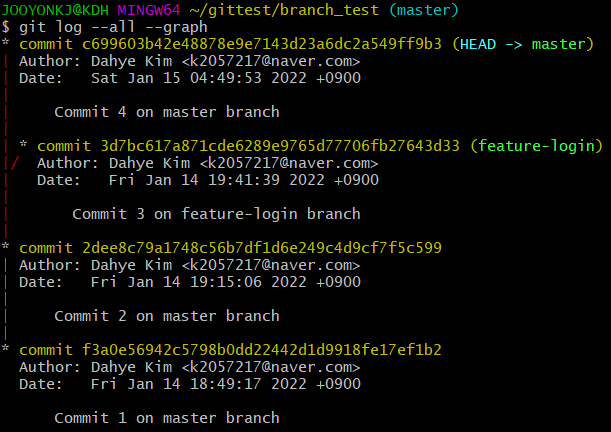 ๊ทธ๋ฌ๋, ๋ธ๋์น์ ์๊ด์์ด ๋ชจ๋ ๋ธ๋์น๋ฅผ ๊ทธ๋ํ ํ์์ผ๋ก ๋ณด๊ณ ์ถ๋ค๋ฉด $ git log --all --graph ๋ช ๋ น์ด๋ฅผ ์คํํ๋ฉด ๋๋ค.