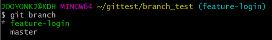 โซ $git checkout feature-login ๋ช ๋ น์ด๋ฅผ ์คํํ๋ฉด ํ์ฌ ์์ ์ค์ธ ๋ธ๋์น(๋ฏผํธ์๊ธ์จ)๊ฐ ๋ณ๊ฒฝ๋์๋ค.