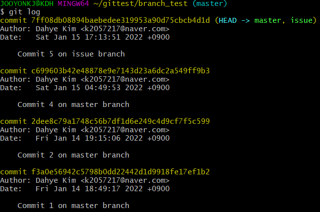 ๋ฐ๋ผ์ issue๋ฅผ ๋ณํฉ์ํฌ๋ ๋ธ๋์น์ ์์น๊ฐ Commit 4์์ Commit 5๋ก ๋ธ๋์น์ ์์น๋ง ๋ณ๊ฒฝ ๋์๋ค๋ ๊ฒ์ ์ ์ ์๋ค.