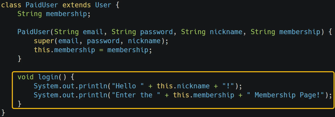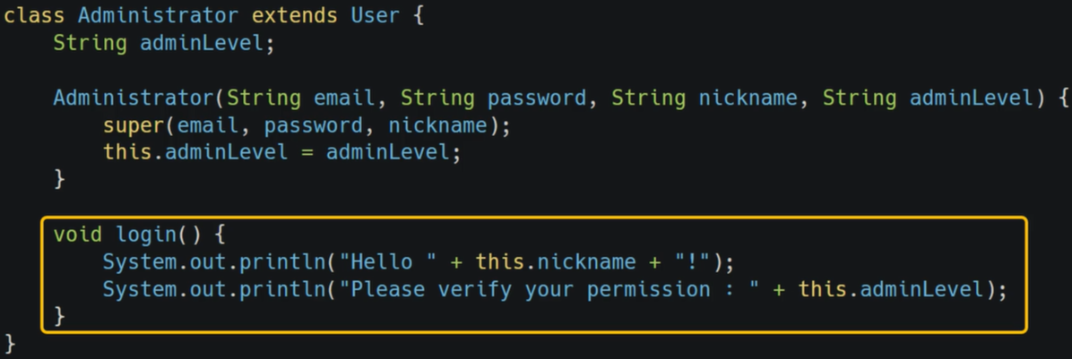 μμ μμ μ½λλ€μ²λΌ λΆλͺ¨ν΄λμ€μΈ User ν΄λμ€μμ μμλ°μ login λ©μλλ₯Ό κ·Έλλ‘ μ¬μ©νμ§ μκ³ , loginμ΄λΌλ κ²μ μ μ¬νμ§λ§ μ½λλ₯Ό μκΈ° νΉμ±μ λ§κ² ꡬννμκΈ° λλ¬Έμ λμλ€μ΄ μ‘°κΈμ© λ€λ₯Έ κ²μ λ³Ό μ μλ€. μ΄λ κ² μ€λ²λΌμ΄λ©μ ν΅ν΄ μ½λμ κ°κ²°μ±μ μ μ§νλ©΄μ λ΄μ©μ νμ₯μν¬ μ μλ€λ μ₯μ μ΄ μλ€.