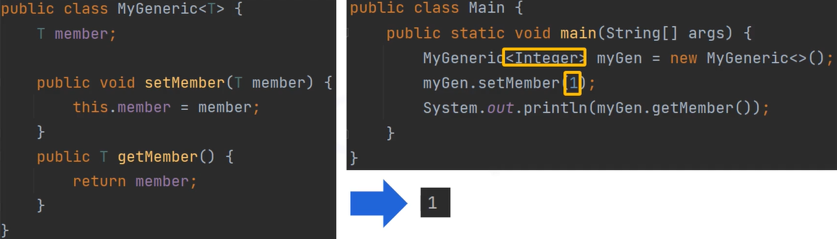 · type variable 'T' λ₯Ό μ΄μ©ν΄ ν΄λμ€ λ΄λΆ λ³μ μμ± λ° λ©μλμ μΈμ, λ°ν κ°μ νμ μ§μ μ΄ κ°λ₯νκ³ , 'T'λ μμκ°μΌλ‘ μ§μ μ΄ κ°λ₯νλ€.