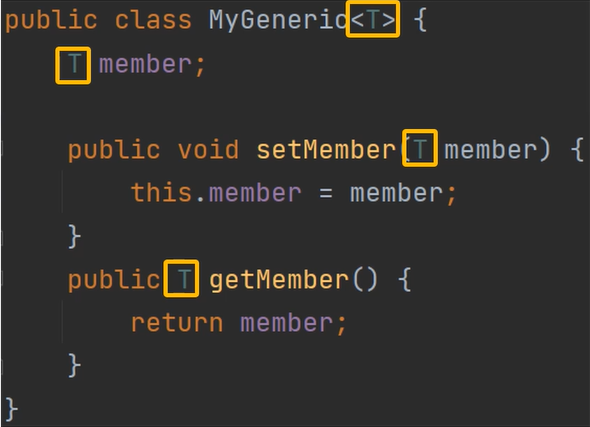 · ν΄λμ€ λ΄λΆμμ μ¬μ©λ μμμ λ°μ΄ν° νμ μ 'T'λΌλ type variableλ‘ μ§μ νκ² λ€λ μλ―Έ