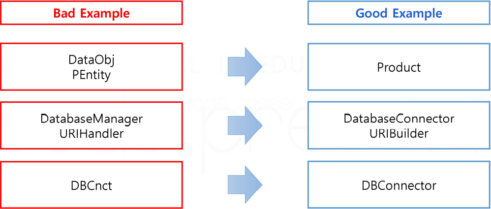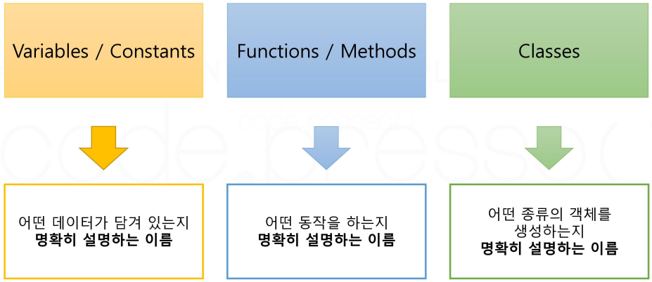- ์ด๋ฆ์ ์ดํด๊ฐ๋ฅํ ์ต์ํ์ ์ ๋ณด๋ฅผ ๋ด๊ณ ์์ด์ผ ํ๋ค. (๋๋ฌด ์งง์ง๋, ์ฅํฉํ์ง๋ ์์์ผ ํจ)