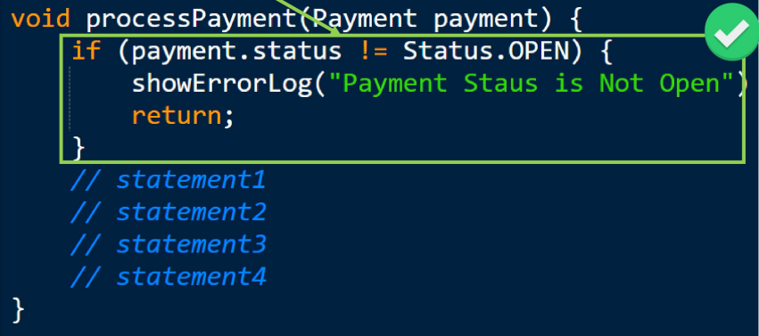 - ๊ฒ์ฆ ์์ญ(์ฝ๋ ์๋จ)๊ณผ ํต์ฌ ๋ก์ง ์์ญ(์ฝ๋ ํ๋จ)์ด ๋ถ๋ฆฌ๋๋ค.
