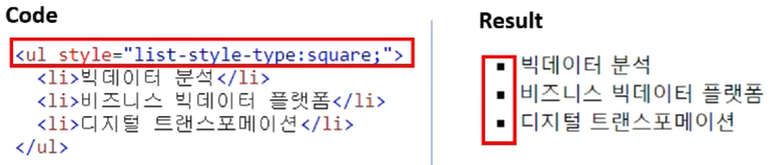 * <ul> ํ๊ทธ ๋ด์ style attribution์ ํ์ฉํ์ฌ ๋ค์ํ ํจ๊ณผ๋ฅผ ์ง์ ํ ์ ์๋ค. (* list-style-type : ํ๋กํผํฐ๋ก ์ ์ ํ์)