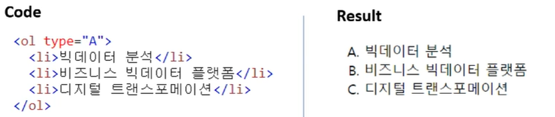 * <ol> ํ๊ทธ ๋ด์ type attribution์ ํ์ฉํ์ฌ ๋ค์ํ ํจ๊ณผ๋ฅผ ์ง์ ํ ์ ์๋ค.