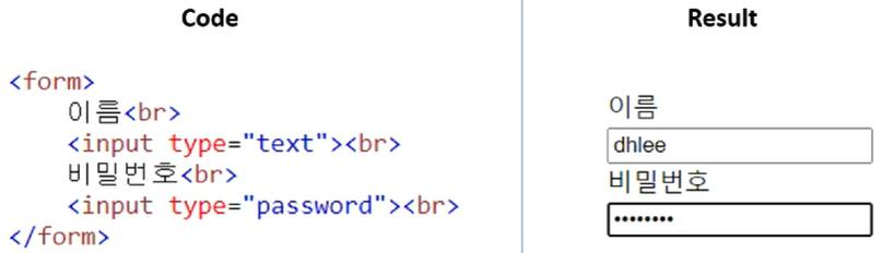 * ์ฌ์ฉ์๋ก๋ถํฐ ์ ๋ ฅ ๋ฐ์ ๊ฐ๊ฐ์ ์ ๋ณด๋ <input> ํ๊ทธ์ type ์์ฑ์ผ๋ก ์ง์