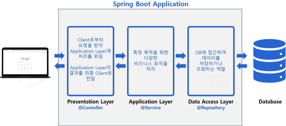 Spring Boot์์๋ Presentation Layer๋ Controller, Application Layer๋ Service, Data Access Layer๋ Repository๋ผ๋ ์ฉ์ด๊ฐ ์ฌ์ฉ ๋๋ค.