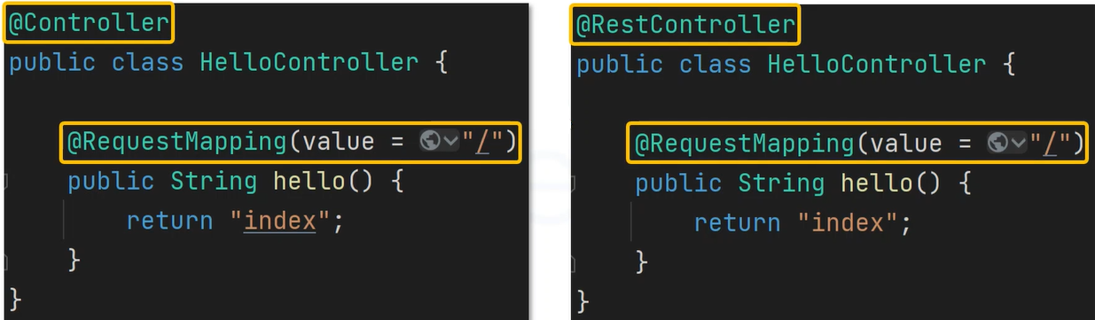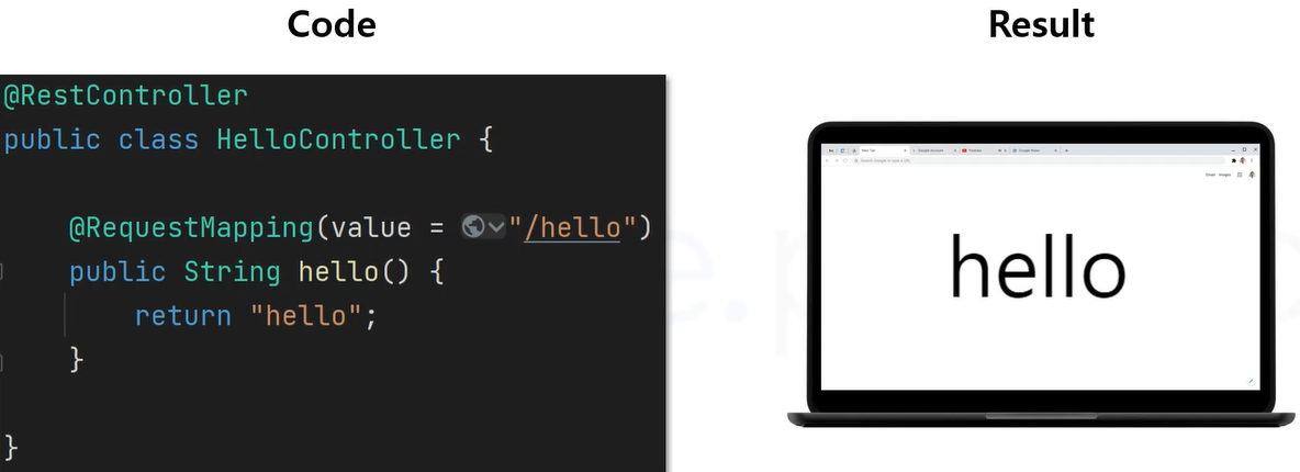 @Controller์์ ๋ฌธ์์ด "hello"๋ htmlํ์ผ(view)์ ์ด๋ฆ์ ์๋ฏธํ์ฌ hello.html์ด๋ผ๋ ๋ฌธ์๊ฐ ์๋ต๋์๋ค