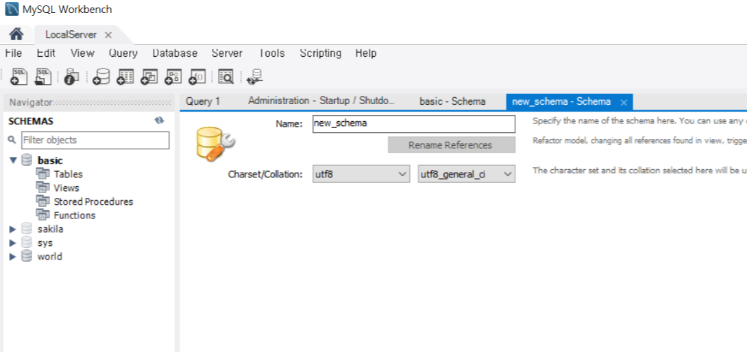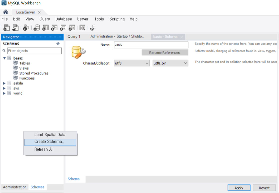 2. Schema ์ด๋ฆ ์ ๋ ฅ ํ, ๊ฐ๊ฐ 'utf8' ๊ณผ 'utf8_general_ci' ๋ก ์ค์ ํ 'Apply' ์ญ ํด๋ฆญ