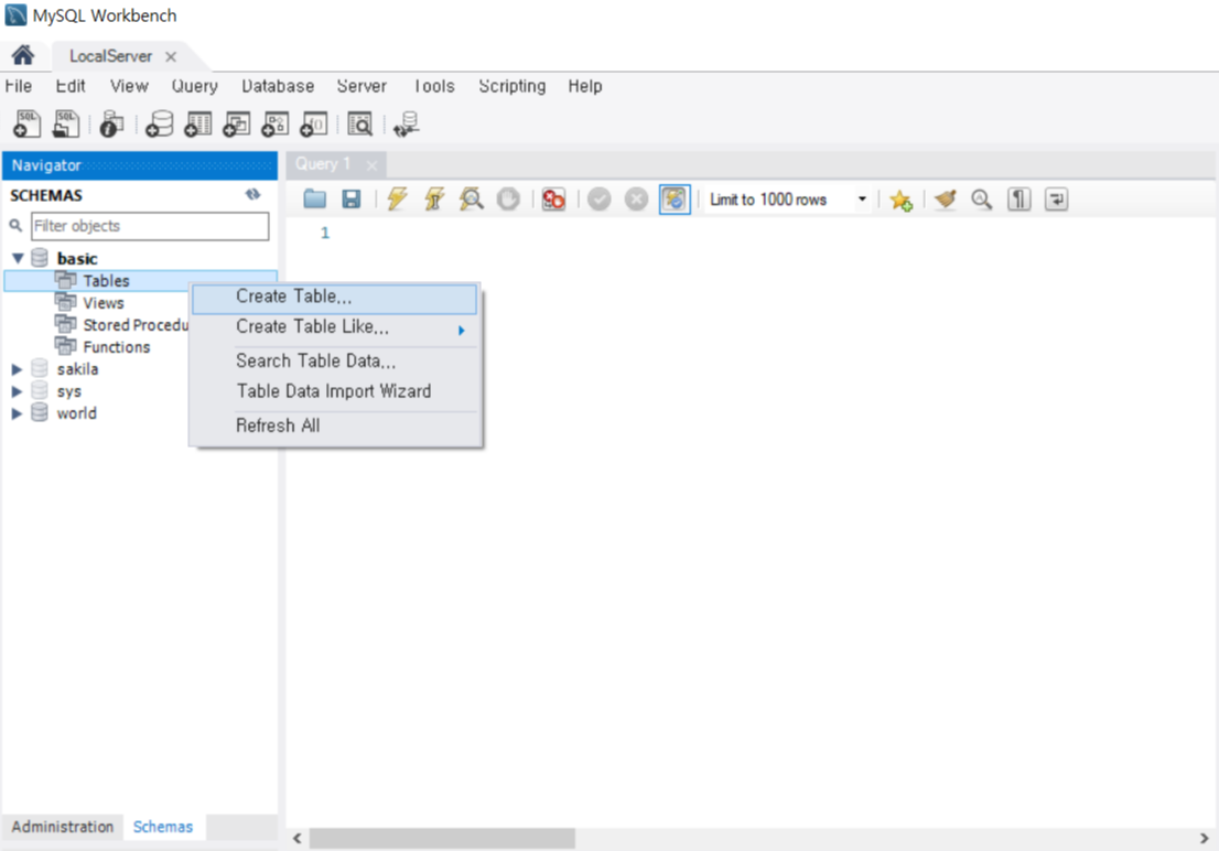 1. Schema์ Table์ ๋ง์ฐ์ค ์ฐํด๋ฆญํ์ฌ 'Create Table' ํด๋ฆญ