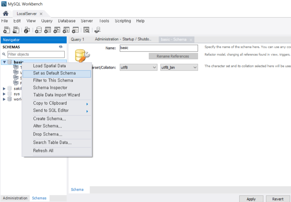 3. Schema ์์ฑ ํ ๋ง์ฐ์ค ์ฐํด๋ฆญํ์ฌ 'Set as Default Schema'๋ฅผ ํด๋ฆญํ์ฌ Schema๋ฅผ default Schema๋ก ๋ณ๊ฒฝํ๋ฉด, SQL์ ๋ง๋ค ๋ Schema ์ด๋ฆ์ ์๋ตํ ์ ์๋ค.
