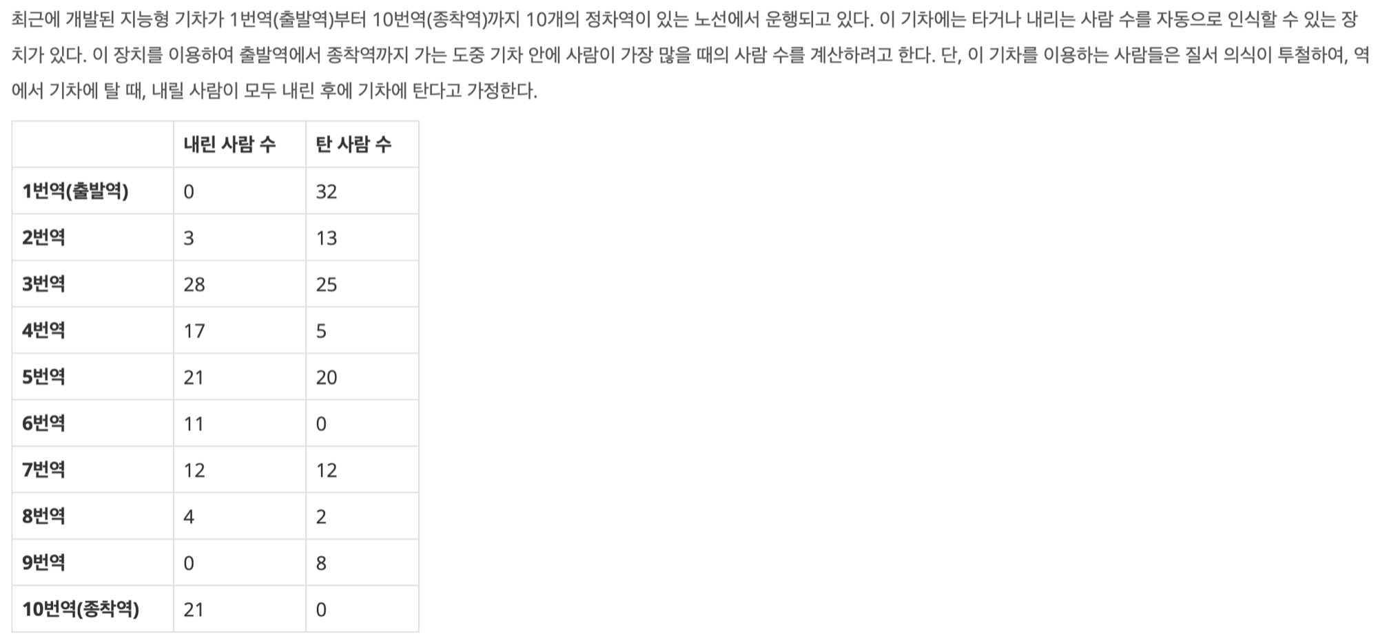 add๋ ๊ฐ ์ญ์์ ํ ์ฌ๋๊ณผ ๋ด๋ฆฐ ์ฌ๋ ์์ ์ฐจ(-) ์ด๋ค. ๋ค์ left ๋ฆฌ์คํธ์๋ ์ฒซ ๋ฒ์งธ ์ญ์์ ๋ฏธ๋ฆฌ ๊ธฐ์ฐจ์ ํ์๋ ์ฌ๋์ ์๊ธฐ ๋๋ฌธ์ ์ฒซ ๋ฒ์งธ ์ธ๋ฑ์ค์ 0์ ๋ฃ์ด ๋ฆฌ์คํธ๋ฅผ ์์ฑํ๋ค. ๊ฐ ์ญ์์ ํ ์ฌ๋๊ณผ ์ ์ญ์์ ๋ฏธ๋ฆฌ ํ์๋ ์ฌ๋ ์์ ํฉ์ left ๋ฆฌ์คํธ์ ์ถ๊ฐํ๋ค.