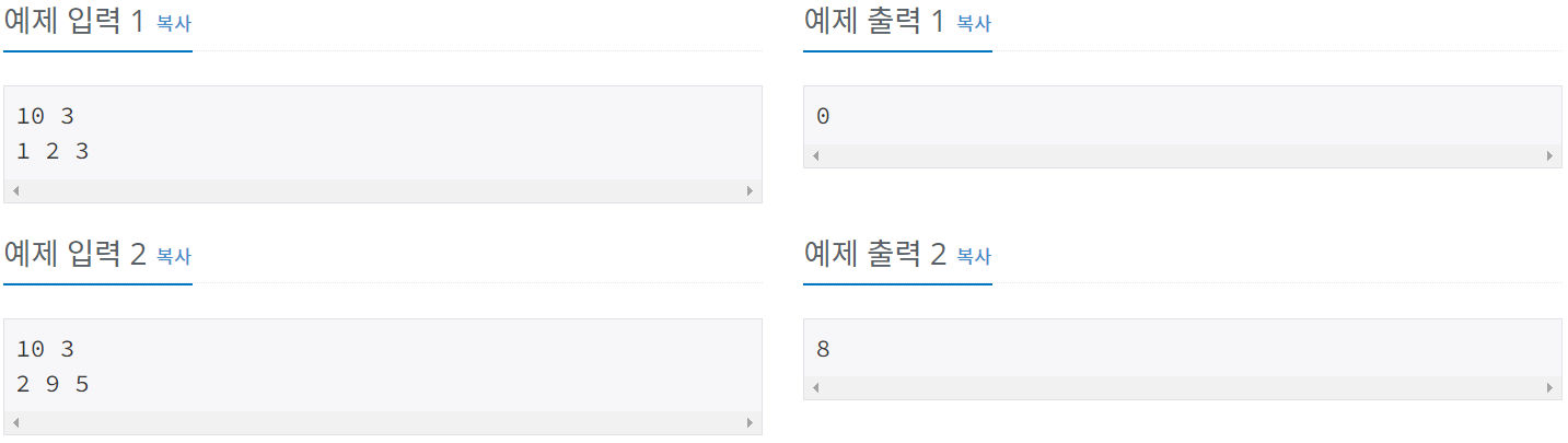 ์ฒซ์งธ ์ค์ ํ์ ํฌ๊ธฐ N๊ณผ ๋ฝ์๋ด๋ ค๊ณ ํ๋ ์์ ๊ฐ์ M์ด ์ฃผ์ด์ง๋ค. N์ 50๋ณด๋ค ์๊ฑฐ๋ ๊ฐ์ ์์ฐ์์ด๊ณ , M์ N๋ณด๋ค ์๊ฑฐ๋ ๊ฐ์ ์์ฐ์์ด๋ค. ๋์งธ ์ค์๋ ์ง๋ฏผ์ด๊ฐ ๋ฝ์๋ด๋ ค๊ณ ํ๋ ์์ ์์น๊ฐ
