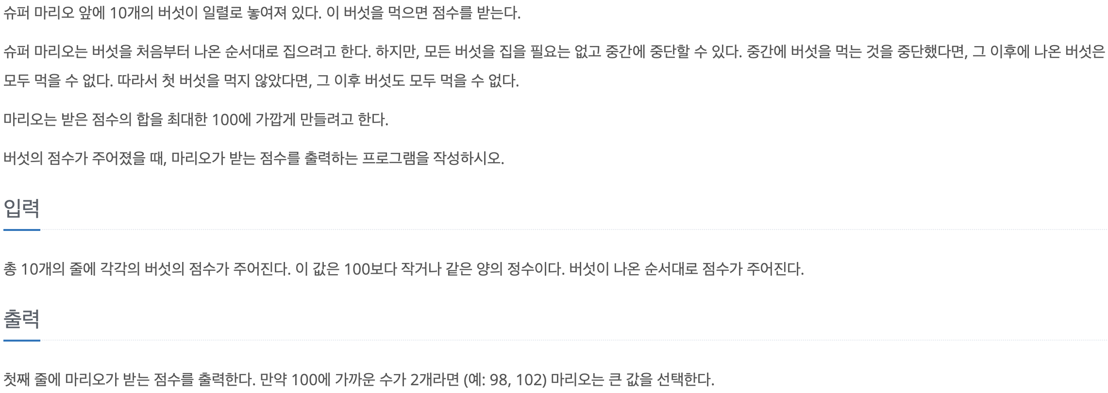 ์ฒซ์งธ ์ค์ ๋ง๋ฆฌ์ค๊ฐ ๋ฐ๋ ์ ์๋ฅผ ์ถ๋ ฅํ๋ค. ๋ง์ฝ 100์ ๊ฐ๊น์ด ์๊ฐ 2๊ฐ๋ผ๋ฉด (์: 98, 102) ๋ง๋ฆฌ์ค๋ ํฐ ๊ฐ์ ์ ํํ๋ค.