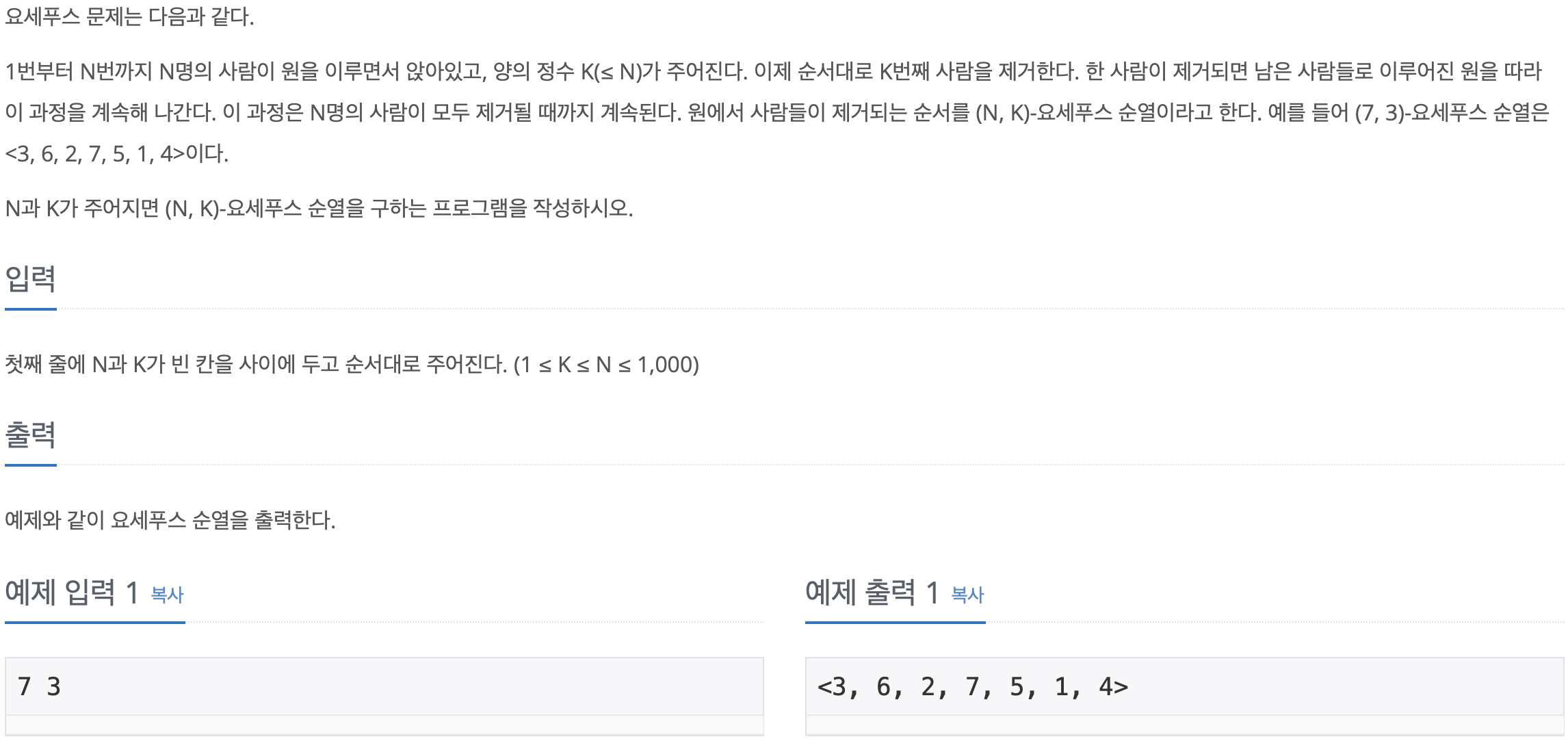 ์ฒซ์งธ ์ค์ N๊ณผ K๊ฐ ๋น ์นธ์ ์ฌ์ด์ ๋๊ณ ์์๋๋ก ์ฃผ์ด์ง๋ค. (1 ≤ K ≤ N ≤ 1,000)