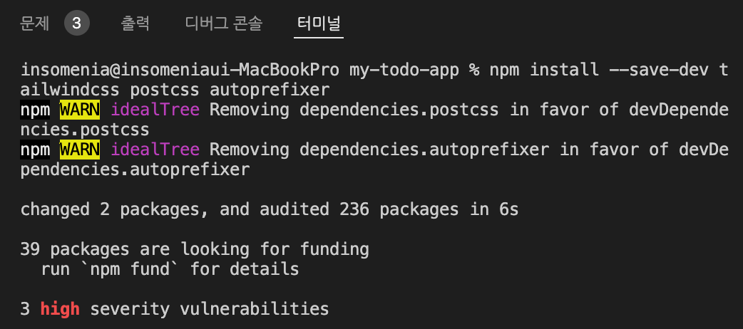 9. ํฐ๋ฏธ๋์ 'npm install --save-dev tailwindcss postcss autoprefixer' ์ ๋ ฅํ๋ค.