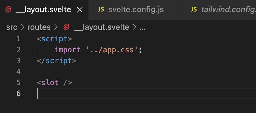 7. src/routes ์ '__layout.svelte' ํ์ผ์, src ์ 'app.css' ํ์ผ์ ์์ฑํ๋ค.